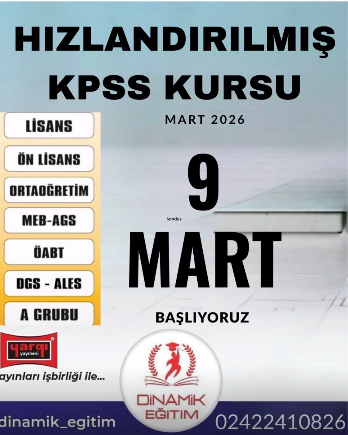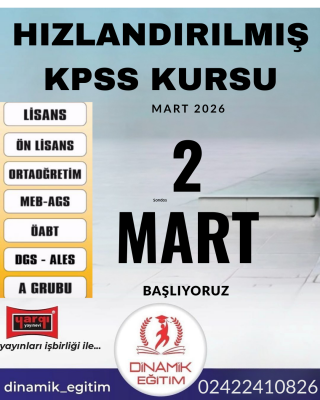 Dinamik Eğitim olarak biz, 2010 yılında KAMU PERSONELİ SEÇME SINAVI (KPSS) - LİSANS- ÖNLİSANS- - LİSE HAZIRLIK VE 6-7-8-9-10-11-12 ve MEZUNLAR için her alanında eğitim faaliyetlerine başladık. 2010 yılından beri ana branş öğretmenleriyle eğitim faaliyetine devam eden Dinamik Eğitim, açıköğretim, kpss, dgs, ales alanında uzmanlaşmış bir öğretmen kuruluşu olarak başarılarına devam etmektedir.